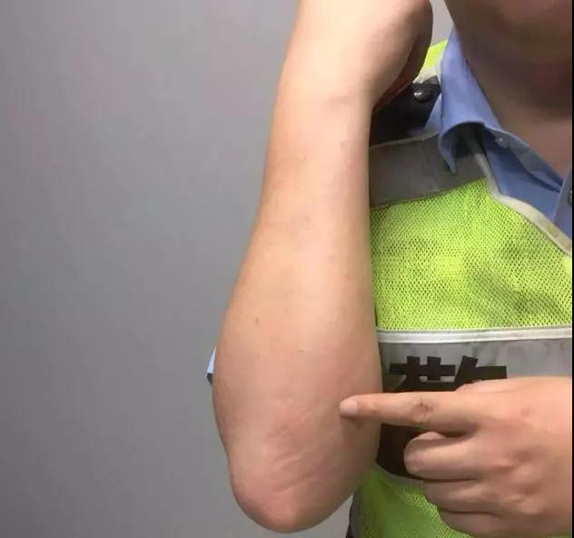 所幸的是刀背砍到手臂,事后他说:“我不能躲,我背后有群众。”