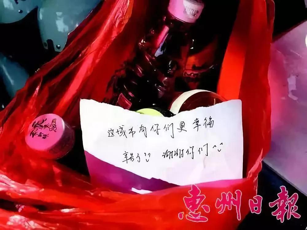 2018年2月,在广东惠东,一位不知名的大姐将6瓶饮料悄悄放在交警的警用摩托车上,并附上一张感谢的纸条后悄然离开。“这城市有你们更幸福,辛苦了!谢谢你们!”