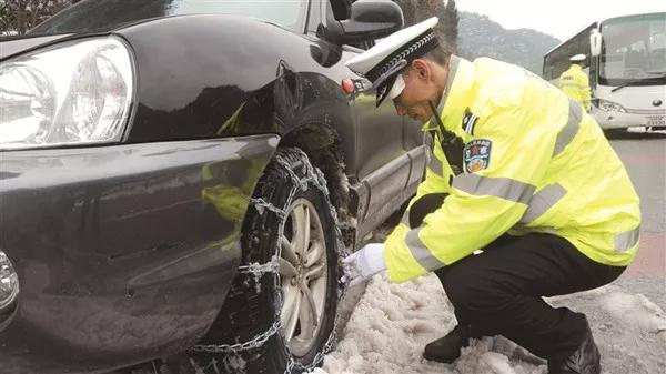 △王丽伟正在为过往车辆检查防滑链。(图/三峡日报)