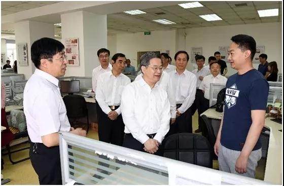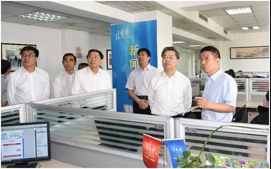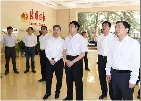 图为中央政法委秘书长陈一新(左四)在法制日报社一楼大厅听取汇报。